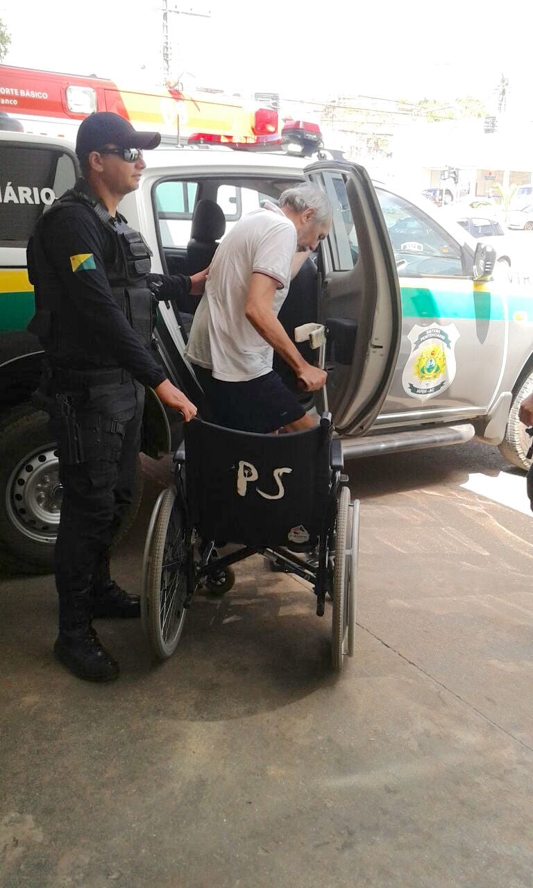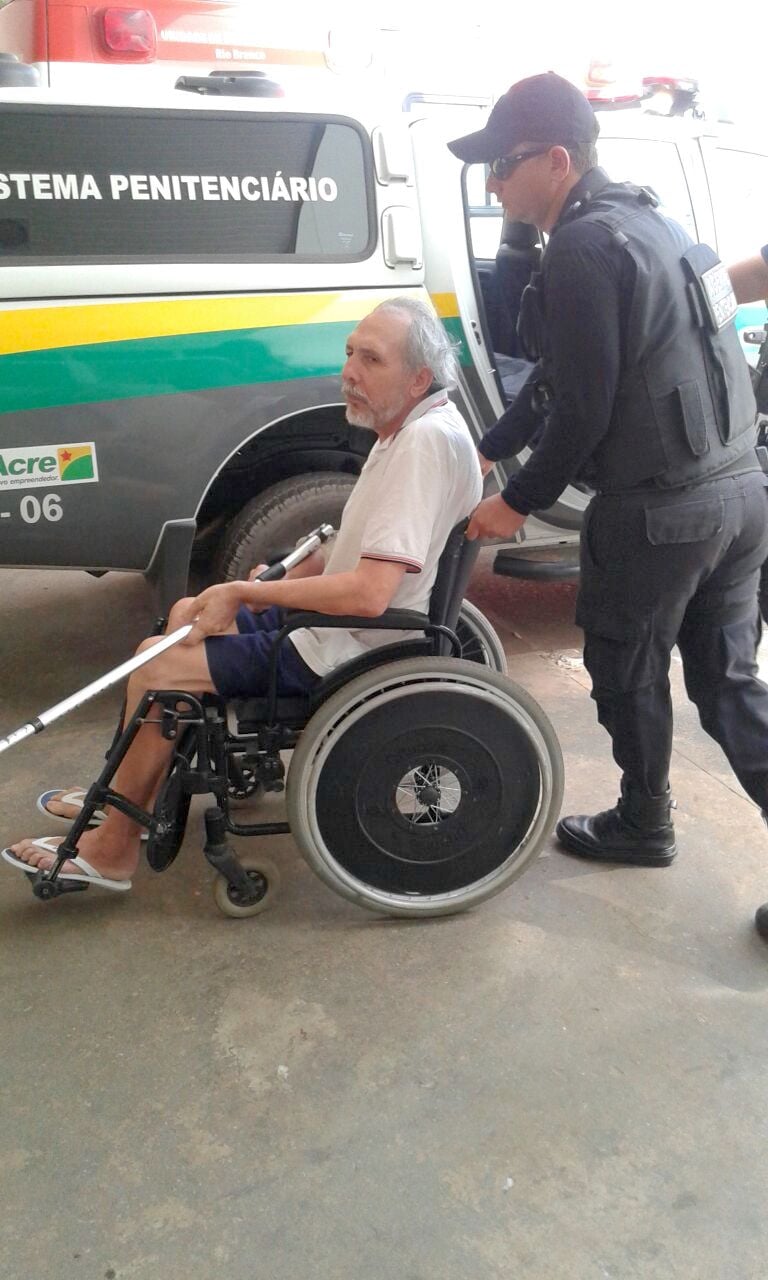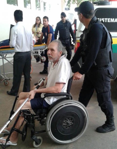 Sentado numa cadeira de rodas empurrada por um policial, visivelmente abatido, barbudo e segurando uma bengala de alumínio, Hildebrando Pascoal recebeu os primeiros atendimentos médicos e foi encaminhado para a ala de observação, onde permaneceu por cerca de quatro horas.