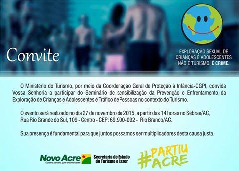Seminário: Prevenção e Enfrentamento a Exploração Sexual de Criança e AdolescenteData e hora: 27/08/2015 (sexta-feira) às 14hLocal: Sebrae/AC, Rua Rio Grande do Sul, 109 – Centro, CEP: 69900-092, Rio Branco/AC.