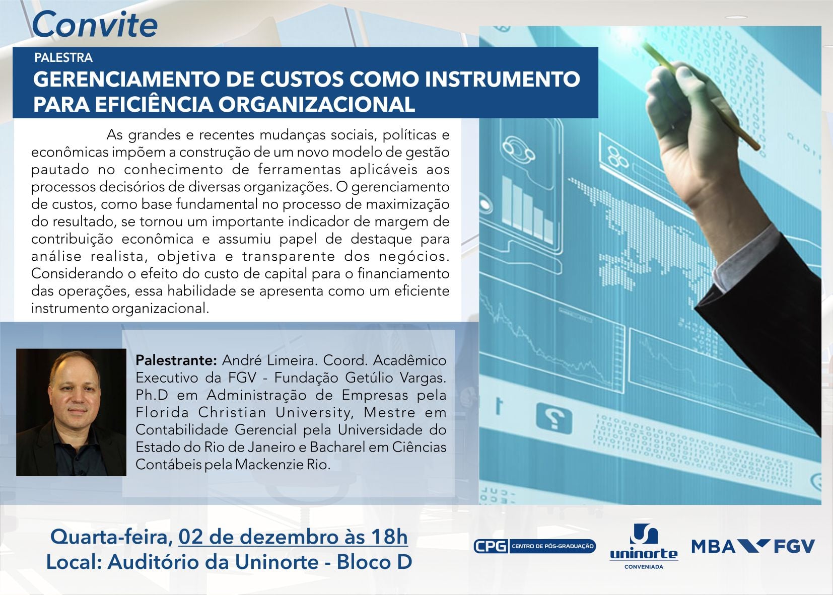A Uninorte realiza nesta quarta-feira, (2) mais uma palestra para discutir um dos temas mais importantes da atualidade, o Gerenciamento de Custos como Instrumento para Eficiência Organizacional. A palestra será ministrada pelo professor André Limeira, Coordenador Acadêmico Executivo da Fundação Getúlio Vargas e um dos maiores especialistas do país no tema, no auditório do Bloco D da Instituição de ensino, a partir das 18h.