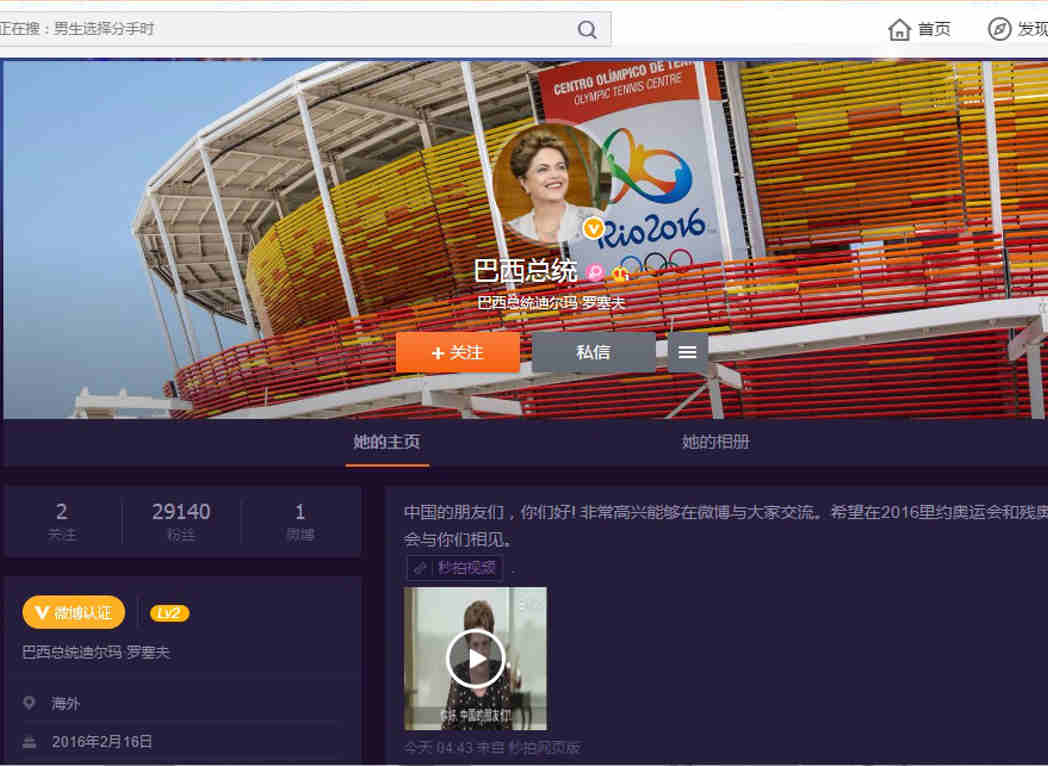 A presidenta Dilma Rousseff criou hoje (25) um perfil na rede social chinesa Weibo, uma espécie de junção entre Twitter e Facebook no país, e postou um vídeo convidando os chineses a vir ao Brasil em agosto para os Jogos Olímpicos e Paralímpicos Rio 2016. Na gravação, a presidenta lembra que a China foi sede dos jogos em 2008, e diz que por isso os chineses sabem da importância das competições para quem recebe atletas e torcedores de todas as partes do mundo.