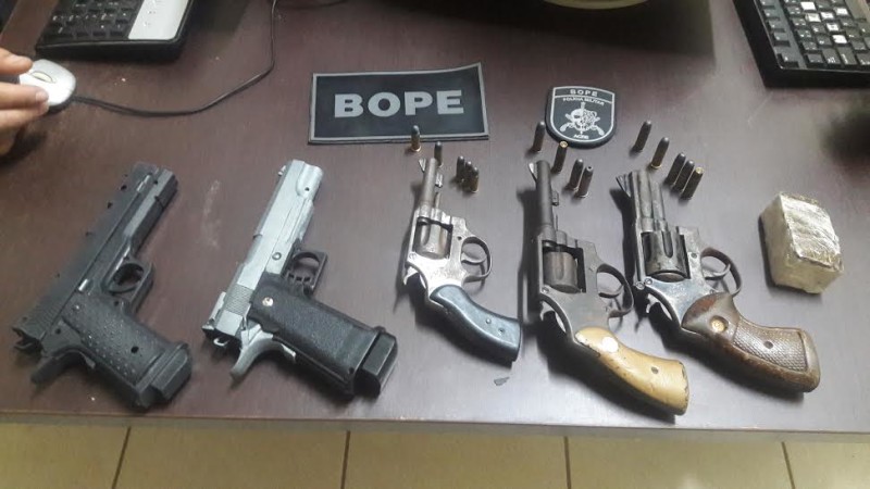A polícia continuou as investigações e conseguiu chegar até a casa do pai do acusado, no mesmo bairro, onde foi encontrado cinco revólveres municiados, usados no roubo e uma barra de maconha.