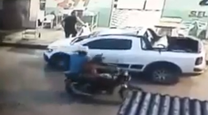Segundos depois, dois suspeitos chegam em uma motocicleta e um deles efetua dois disparos em direção do sargento. Ao ouvir os tiros, o policial se esconde atrás de uma placa e um veículo que estava estacionado. Ele ainda corre em direção dos suspeitos, mas nada pode fazer. Por sorte nenhum dos disparos atingiu o militar.