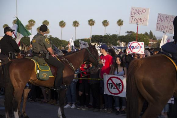 Centenas de pessoas protestaram nas ruas de Costa Mesa, na Califórnia, contra o empresário Donald Trump, que está na disputa para representar o Partido Republicano nas eleições presidenciais nos Estados Unidos, em novembro deste ano. Várias comunidades de imigrantes se opõem à candidatura de Trump por temerem que, se eleito, ele adote políticas mais duras contra a permanência de estrangeiros no país.