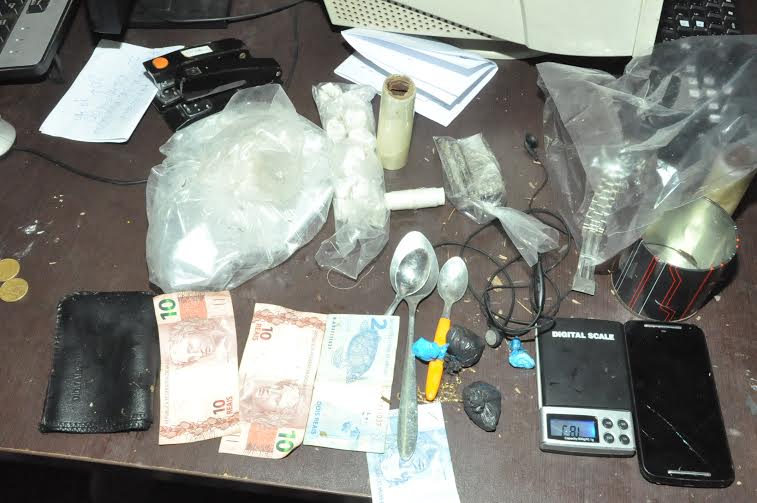 Na revista pessoal foram encontradas 25 trouxinhas de pasta base de cocaína, duas trouxinhas de cocaína pura, cinco tabletes de maconha e uma balança de precisão.