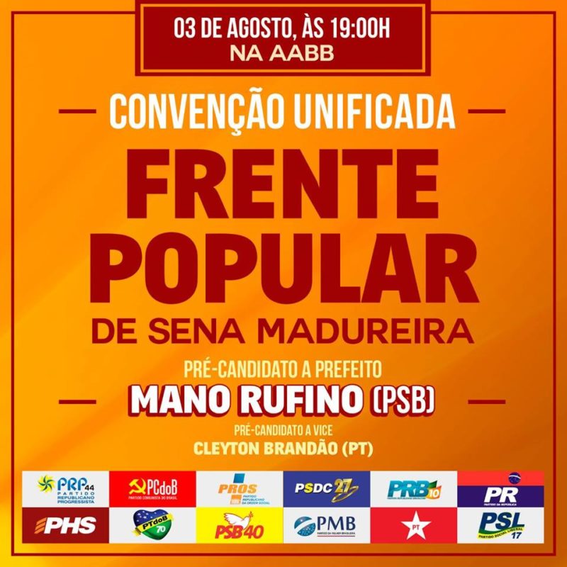 Os partidos que integram a Frente Popular do Acre (FPA), em Sena Madureira, irão realizar na noite de hoje suas convenções para definir oficialmente os candidatos que estarão disputando os cargos de prefeito, vice-prefeito e vereador. O evento ocorrerá no clube da Associação Atlética Banco do Brasil (AABB), a partir das 19 horas e promete ser uma marcante festa política.