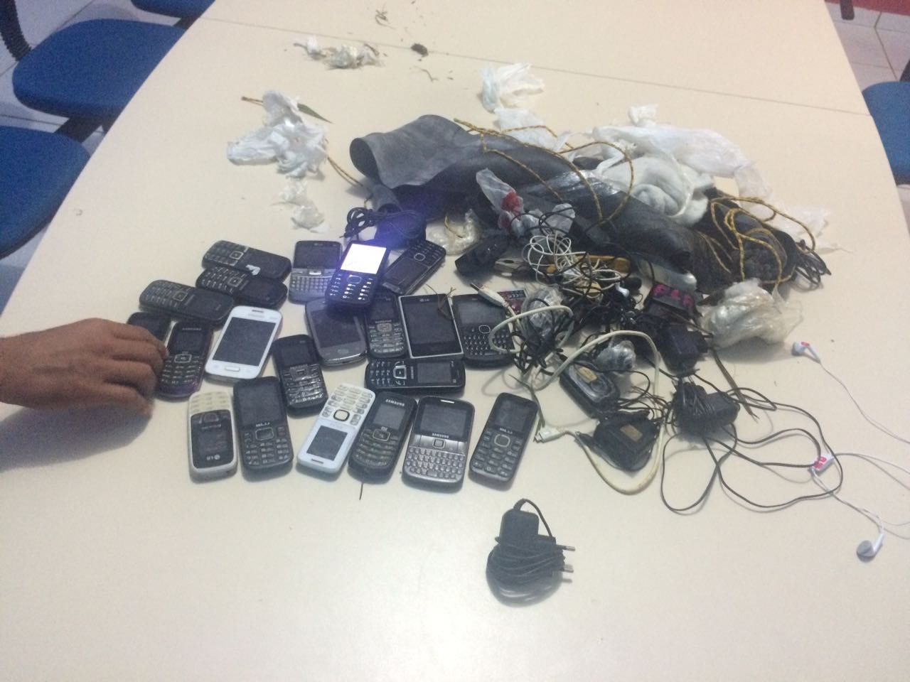 De acordo com os agentes, eles perceberam o barulho do material caindo no chão e fizeram uma busca pelos arredores da muralha dentro do presídio. Em um saco foram encontrados os 20 aparelhos celulares, carregadores e fones de ouvido.