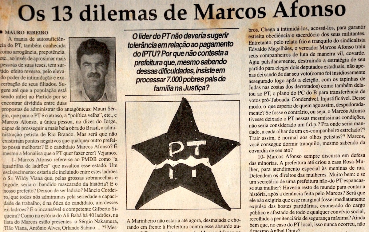 O tempo passa, o tempo voa. E a internet nos traz tudo de volta. O trecho e a imagem são do Blog do Altino Machado: Era domingo, 22 de setembro de 1996, quando o agrônomo Mauro Ribeiro assinou em A Gazeta duro artigo contra o PT, os irmãos Jorge e Tião Viana, e o então candidato petista à prefeitura de Rio Branco, Marcos Afonso. Trecho inicial daquela opinião de Mauro Ribeiro há 16 anos: