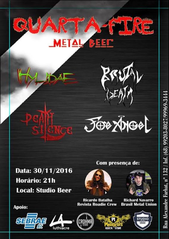 Os grupos de Heavy Metal Hylidae, Brutal Death, Death Silence e Fire Angel, se apresentam nesta quarta-feira. 30, a partir das 21 horas, a “Quarta-Fire”, no Studio Beer. Além das bandas, o evento contará com a presença do editor-chefe da revista Roadie Crew, Ricardo Batalha, e o idealizador de um dos maiores festivais de metal do país, o Brasil Metal Union (BMU), Richard Navarro.