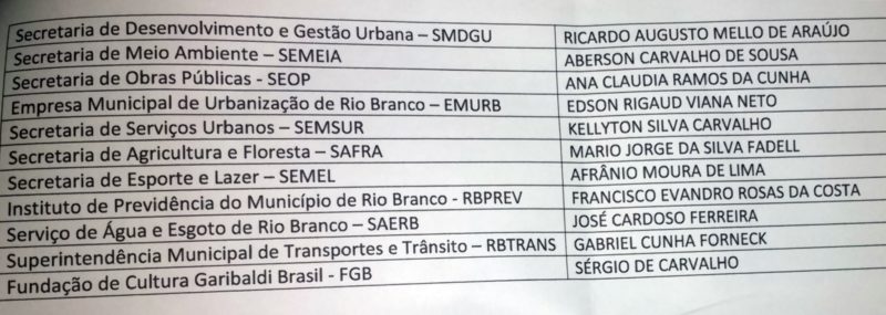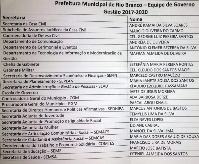 Prefeito reeleito de Rio Branco, Marcus Alexandre (PT) anunciou na manhã desta sexta-feira (30) a nova equipe de gestão com poucas mudanças. Somente 10 dos 34 cargos foram mudados e a próxima gestão terá 10 mulheres em cargos de primeiro escalão. Os cargos de segundo escalão começam a serem nomeados na próxima semana.