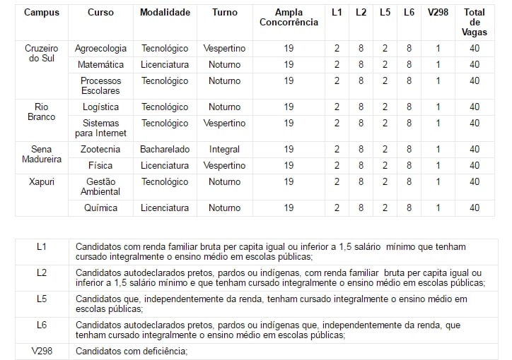 Nesta edição, as vagas disponibilizadas pelo IFAC são nas modalidades: tecnológico, licenciatura e bacharelado. Os campus com vagas disponíveis são: Cruzeiro do Sul, Rio Branco, Sena Madureira e Xapuri. Já os cursos ofertados são: Agroecologia, Matemática Processos Escolares, Física, Zootecnia, Gestão Ambiental, Química, Logística e Sistemas para Internet.
