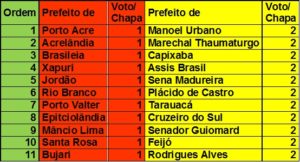 O prefeito de Cruzeiro do Sul retirou a sua candidatura e apoiou a prefeita de Taraucá, Marilete Vitorino (PSD). A reviravolta fez o prefeito de Sena Madureira, cujo voto era declarado pela reeleição de Marcus Alexandre (PT), participasse da chapa de Marilete. Outro voto apontado como sendo para o prefeito da capital, do prefeito de Senador Guiomard, André Maia (PSD), também mudou de lado. Mesmo sendo integrante da chapa de Alexandre, ele votou em Marilete.