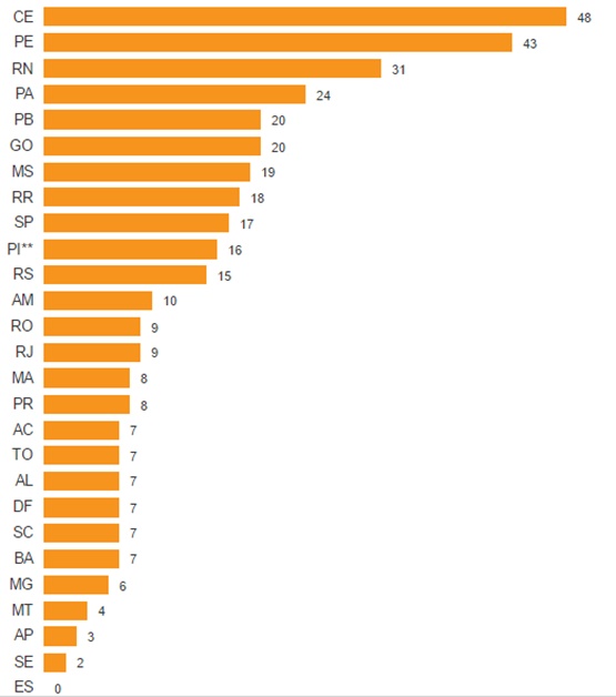 Mais da metade desses crimes do ano passado (182) está concentrada no Nordeste. O ranking nacional é liderado pelo Ceará, com 48 assassinatos. O auge da crise da segurança no Estado foi em maio, quando 14 detentos morreram em dois dias em rebeliões em cinco presídios. A facção criminosa Família do Norte, que liderou o massacre desta semana em um complexo penitenciário no Amazonas, tem forte atuação na região.