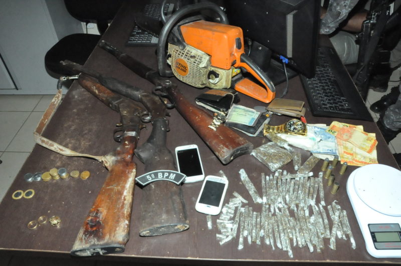 Também foram apreendidos um Rifle calibre 44 e outro calibre 22, uma espingarda calibre 20, dinheiro e uma balança de precisão. Os acusados, as drogas e as armas foram encaminhados à Delegacia Central de Flagrantes, onde eles podem responder por crimes de associação criminosa, tráfico de drogas e porte ilegal de arma de fogo.