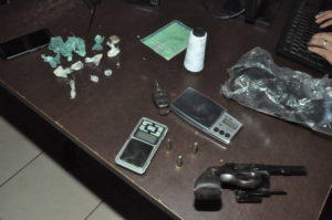 Foi encontrado um revólver calibre 38, com a numeração raspada e drogas/Foto: Reprodução.
