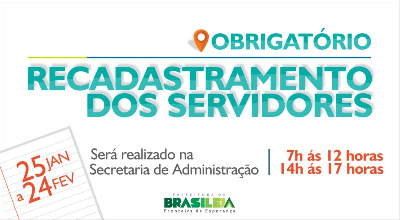 A prefeitura de Brasileia, por meio da Secretaria de Administração, começou na quarta-feira, dia 25 de janeiro, o recadastramento dos servidores, o prazo final será no dia 25 de fevereiro. O recadastramento é obrigatório para todos os servidores, empregados públicos ou inativos.