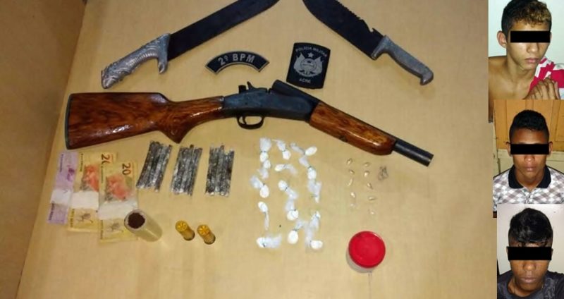 Na noite deste domingo (26), três adolescentes de 15 e 16 anos foram apreendidos portando uma escopeta calibre 20 com munições, drogas e armas brancas.