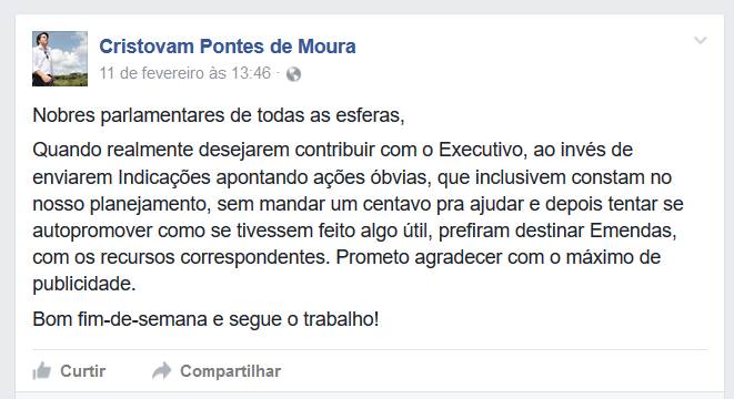 Em sua postagem, Pontes critica os parlamentares que, segundo ele, ao enviarem somente ideias, ainda tentar se autopromover como se tivessem feito algo útil, sem garantir nenhum recurso para a instituição.