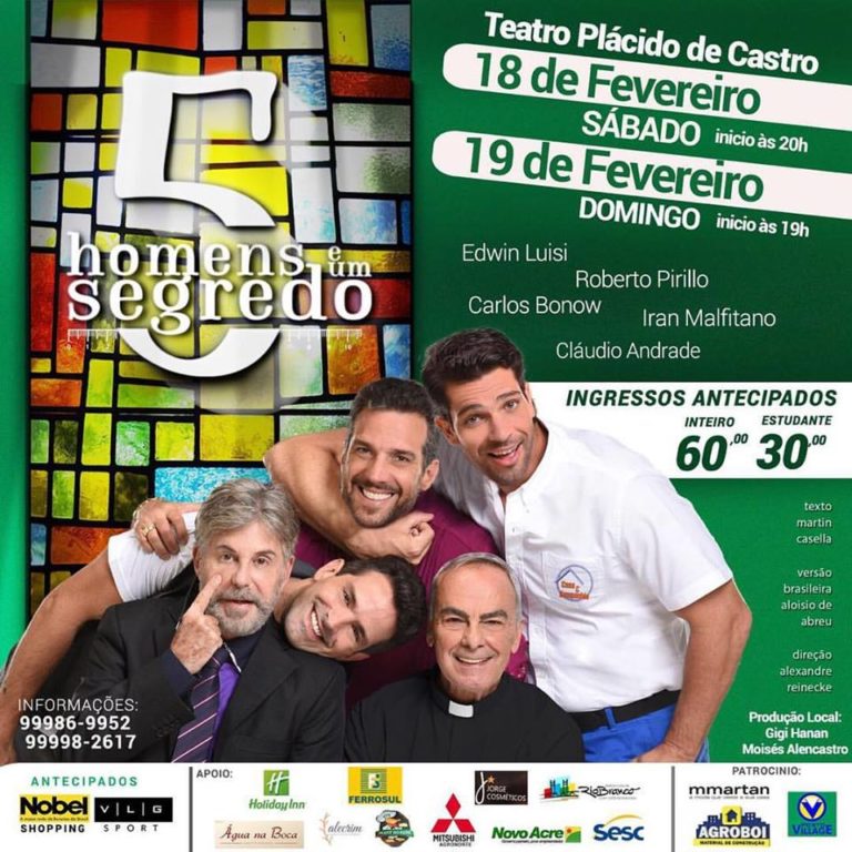 A comédia 5 Homens e um Segredo será apresentado em Rio Branco nos dias 18 e 19, às 20h e 19h, respectivamente, no Teatro Plácido de Castro. Os ingressos custam R$ 60 inteiro e R$ 30 estudante. Vendas: VLG Sport e Livraria Nobel do Via Verde Shopping.