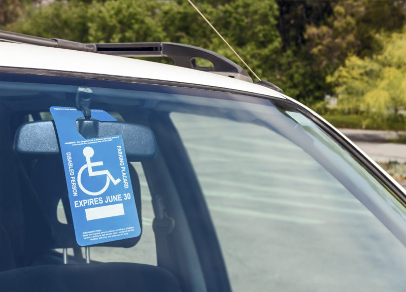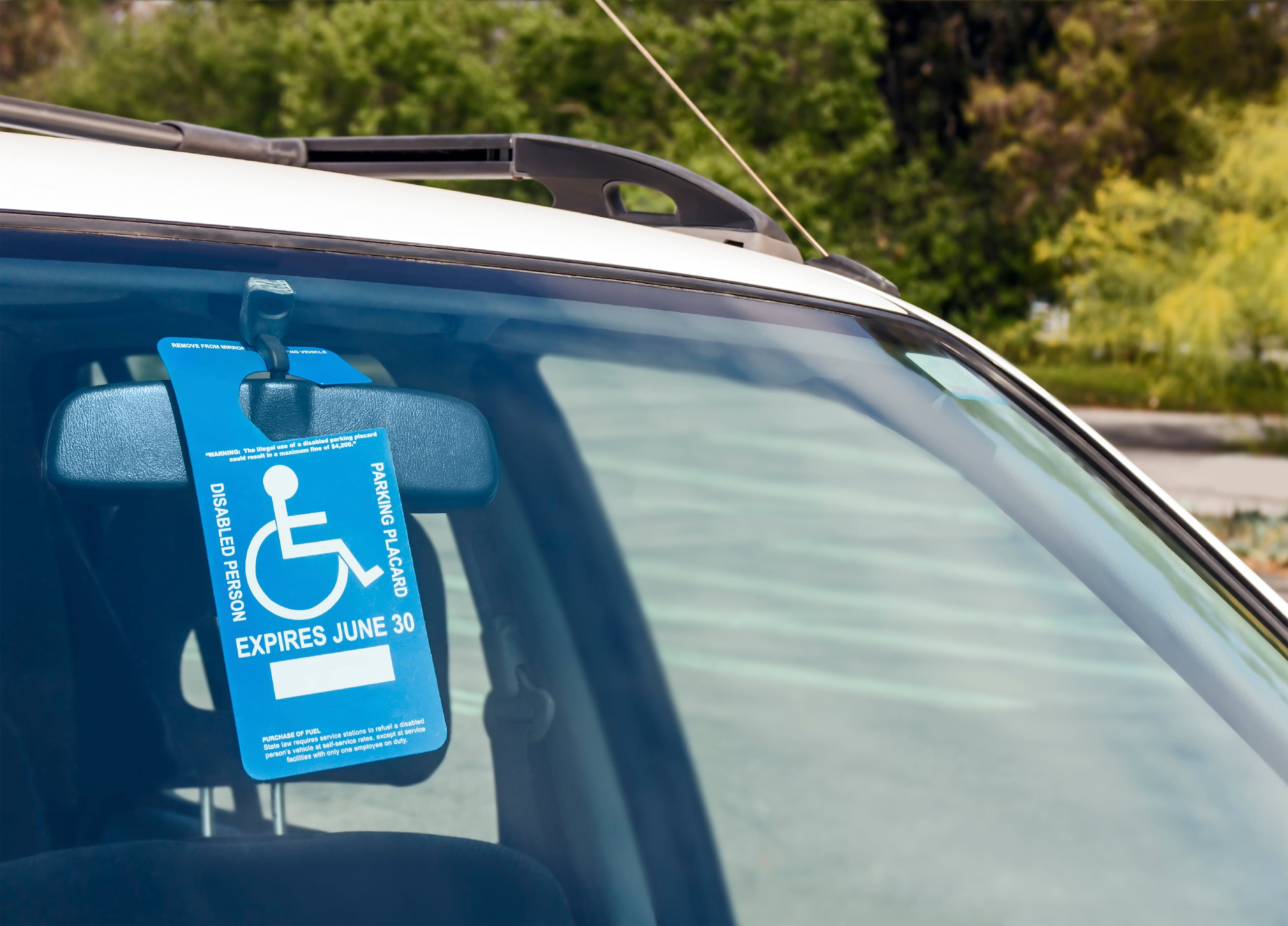 Wheelchair icon, instructions, and expiration date. Hanging from car rear view mirror, visible through front windshield in rural parking lot.
