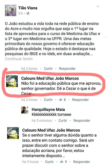 Entretanto, a publicação não agradou João, que respondeu à declaração do governador: “Não foi a Educação pública que me aprovou, senhor governador. Dê a Cezar o que é de Cezar”, escreveu em um primeiro comentário, logo depois, o estudante continuou: “Se o senhor tiver alguma dúvida quanto a isso, entre em contato comigo. Será um prazer discutir com o senhor sobre a Educação acreana, por favor, estou inteiramente disposto”.