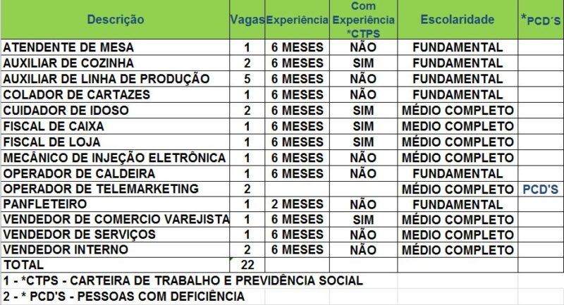 O Sistema Nacional de Emprego do Acre (Sine) disponibiliza 22 vagas para diversas áreas nesta quarta-feira (1). Os candidatos interessados devem comparecer pessoalmente à instituição, localizada na Avenida Getúlio Vargas, n°1.670, em Rio Branco.