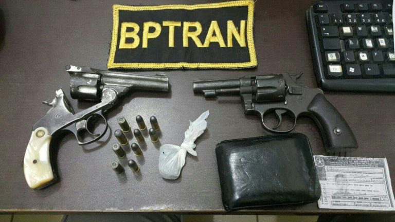 Policiais militares do Batalhão de Policiamento de Trânsito (BPTRAN) prenderam na noite desta quinta-feira (9) dois homens com duas armas de fogo durante a Operação Álcool Zero. Conforme consta no Boletim de Ocorrência (B.O), a operação estava montada na Estrada das Placas, bairro Wanderley Dantas, quando foi dado voz de parada para uma dupla em uma motocicleta.