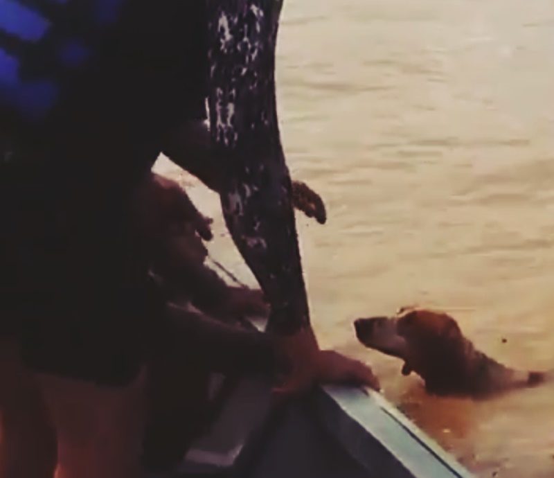 Durante a enchente do Rio Juruá, homens do Corpo de Bombeiros que realizavam operações emergenciais às famílias atingidas pela cheia resgataram um cão que estava sendo levado pela forte correnteza do rio.