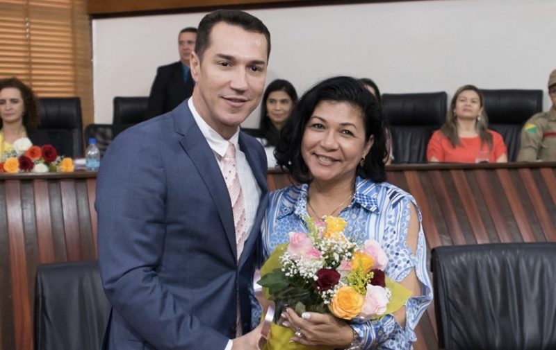 Deputada Eliane Sinhasique recebendo homenagem das mãos do presidente da Aleac, Ney Amorim /Foto: Assessoria