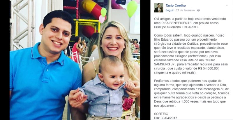 Os pais de Eduardo Lopes, de apenas 9 meses de idade, usaram as redes sociais nos últimos dias para vender rifas e pedir doações para o filho que precisa fazer uma cirurgia em outro Estado.