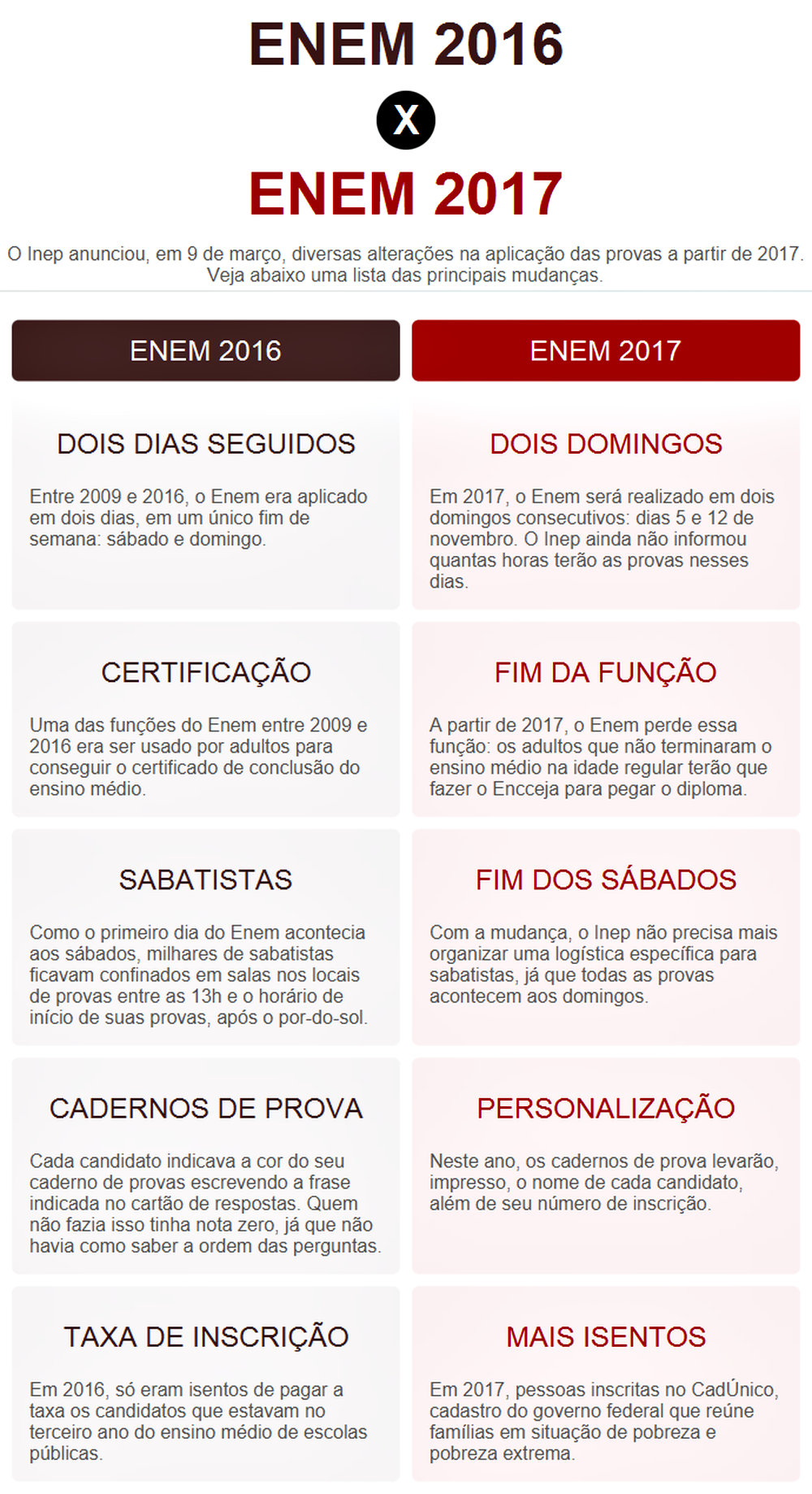 O Exame Nacional do Ensino Médio (Enem) 2017 será realizado em dois domingos consecutivos: 5 e 12 de novembro. No ano passado, a prova foi aplicada em um fim de semana (sábado e domingo, 5 e 6 de novembro). A modificação foi divulgada pelo Ministério da Educação (MEC), na manhã desta quinta-feira (9).