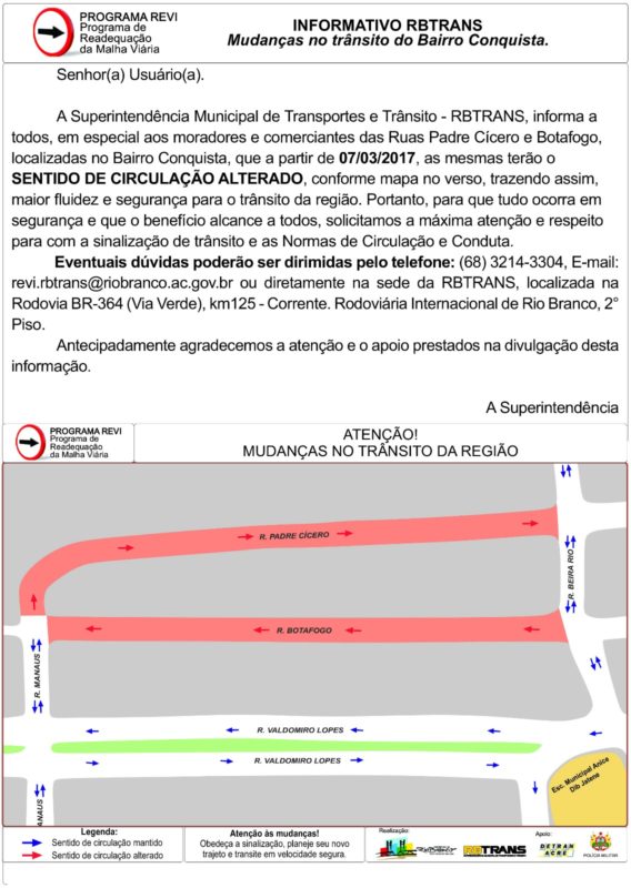 A partir desta terça-feira (7), as Ruas Padre Cícero e Botafogo, localizadas no Bairro Conquista, em Rio Branco, terão o sentido de circulação de veículos alterado. De acordo com a Superintendência Municipal de Trânsito (RBTrans), a medida visa maior fluidez e segurança para o trânsito da Região.