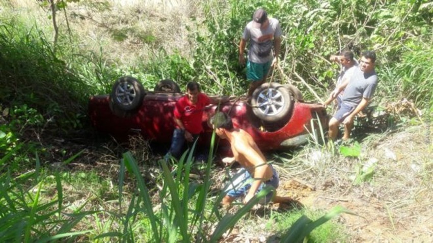 Carro cai em barranco de rio após tentar desviar de cachorro em Brasileia