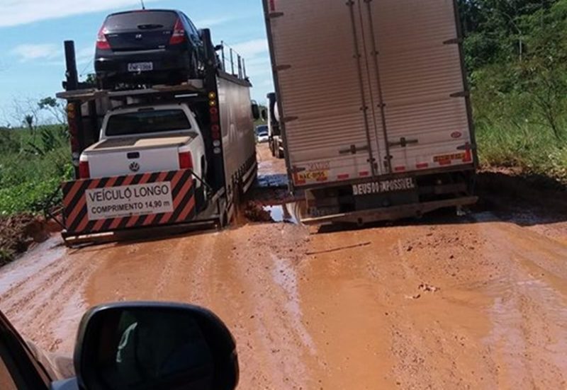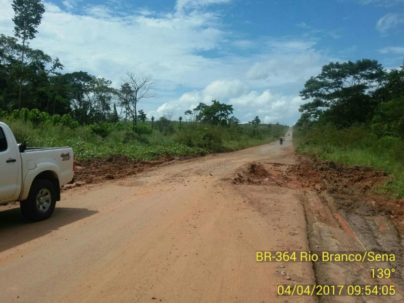 A pedagoga Zeneide Diniz publicou em sua página pessoal do Facebook uma trágica situação em um trecho da BR-364, próximo ao Antimary, quando se deslocava de Sena Madureira para a Capital. A foto é de um buraco fundo que toma grande parte da estrada. No momento em que ela passava pelo local, dois caminhões atolaram na cratera por causa da grande quantidade de lama.