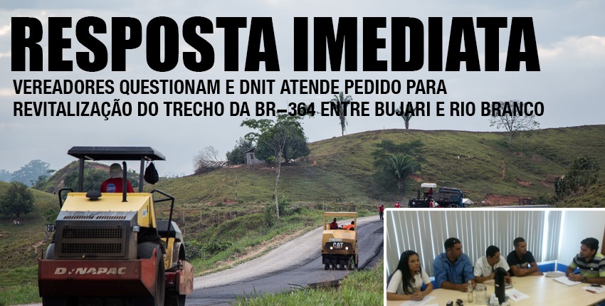 Na última segunda-feira (24), a vereadora do Bujari, Maria de Jesus (PMDB), entrou com um requerimento junto ao Departamento Nacional de Infraestrutura e Transportes (DNIT) pedindo urgência na recuperação do trecho da BR-364 entre o município e o aeroporto de Rio Branco. Segundo ela, a situação da rodovia é precária devido à grande quantidade de buracos neste trajeto.