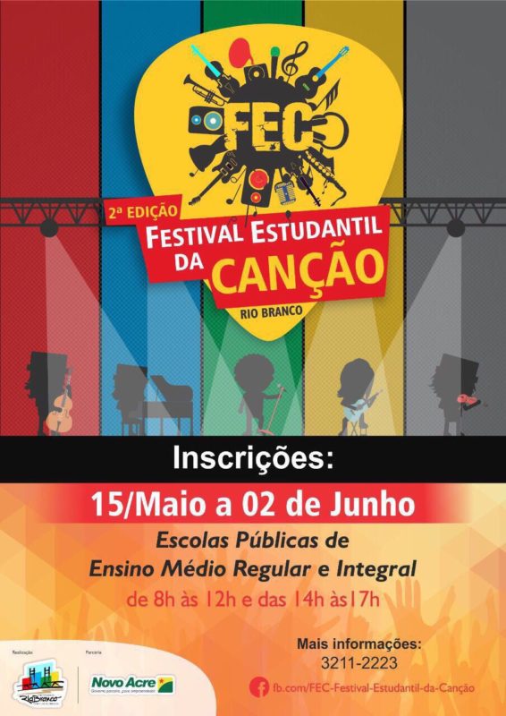 Estão abertas as inscrições para o Festival Estudantil da Canção (FEC), que começará no dia 23 de maio com a final marcada para o dia 12 de agosto. Para participar, é necessário ter entre 13 e 29 anos de idade e estar regularmente matriculados no Ensino Médio nas redes pública estadual ou privada de ensino. Serão premiadas as três primeiras canções, com ênfase na letra e na melodia.