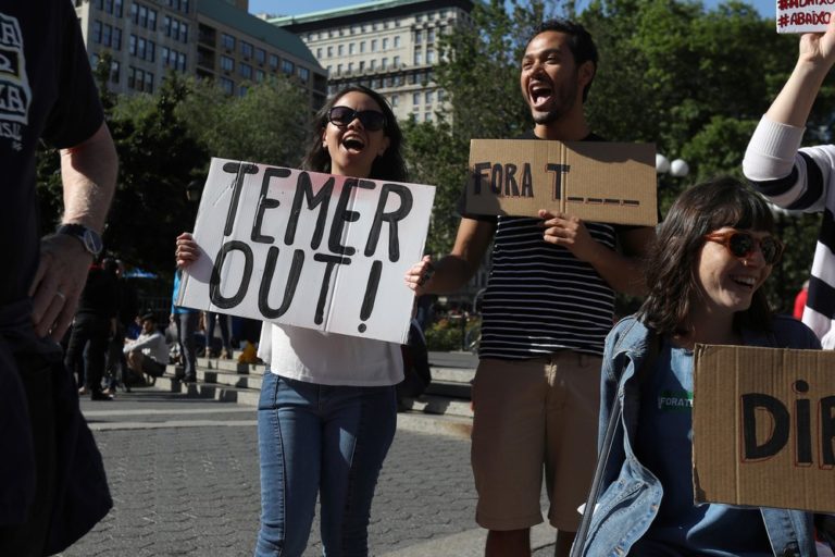 Também houve protesto de brasileiros na Union Square, em Nova York, com faixas de Fora Temer.