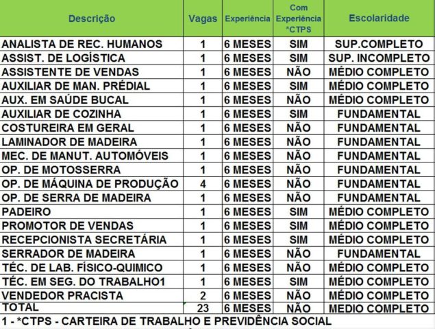 O Sine oferece 23 vagas para diversas áreas, nesta sexta-feira (12). Os candidatos interessados devem comparecer pessoalmente à instituição, localizada na Avenida Getúlio Vargas, n°1.670, em Rio Branco.