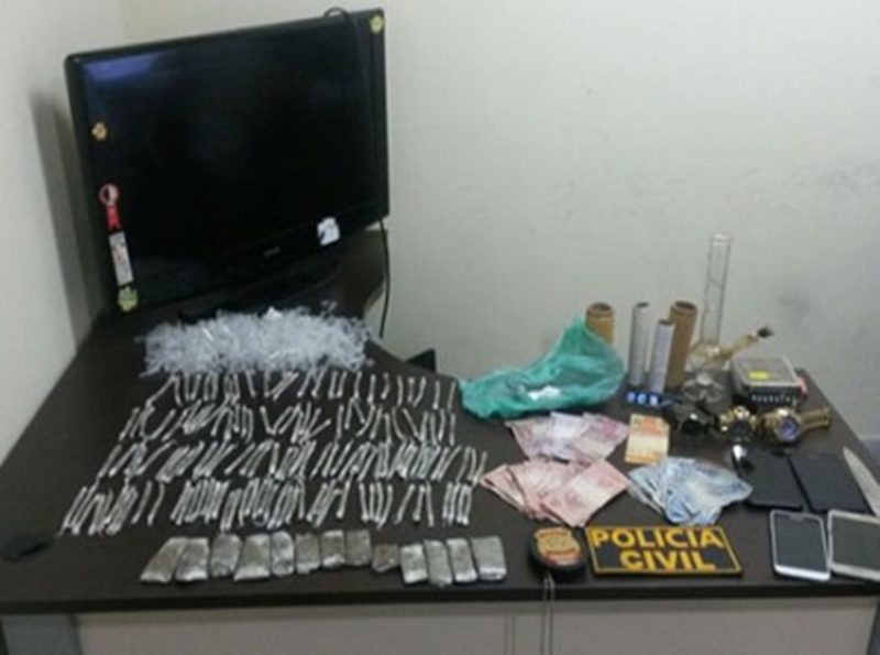 Com os acusados a polícia encontrou 160 tabletes de maconha, uma porção de cocaína, R$ 350, vasto material para embalagem da droga, além de uma balança de precisão.