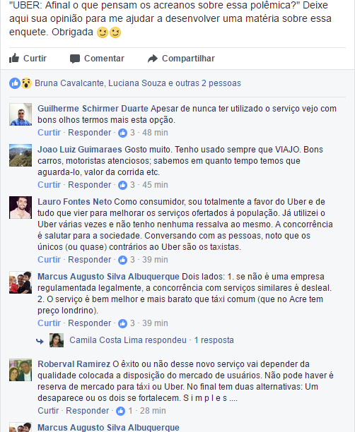 “Dois lados: 1. Se não é uma empresa regulamentada legalmente, a concorrência com serviços similares é desleal. 2. O serviço é bem melhor e mais barato que táxi comum (que no Acre tem preço londrino)”, opinou Marcos Albuquerque.