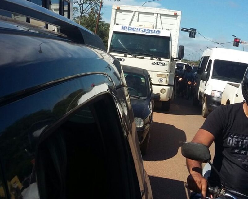 A Via Chico Mendes voltou a ser bloqueada na manhã desta quarta-feira (7) em frente ao Parque de Exposições Marechal Castelo Branco. A fila de carros é quilométrica no acesso para o centro da Capital e para os bairros Vila Acre.