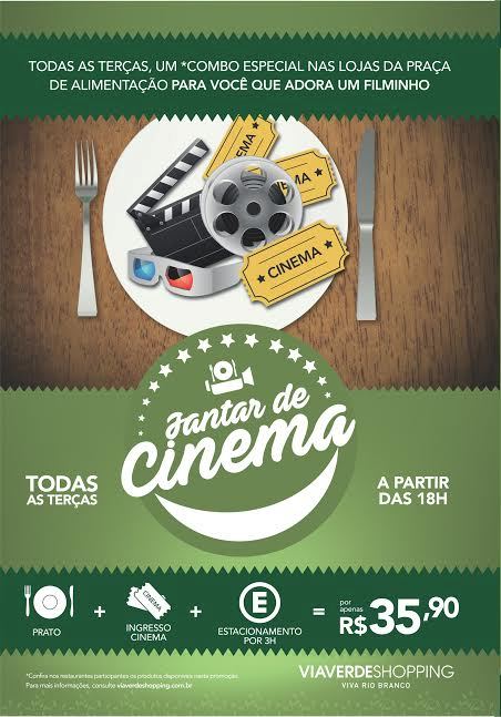 Quem disse que dia de terça-feira não tem programação legal e barata na cidade? Tem sim! Tudo que você queria em um só pacote: jantar + cinema (2D) + estacionamento (3h) por apenas R$ 35,90. Um sonho que se tornou realidade com a promoção Jantar de Cinema do Via Verde Shopping.