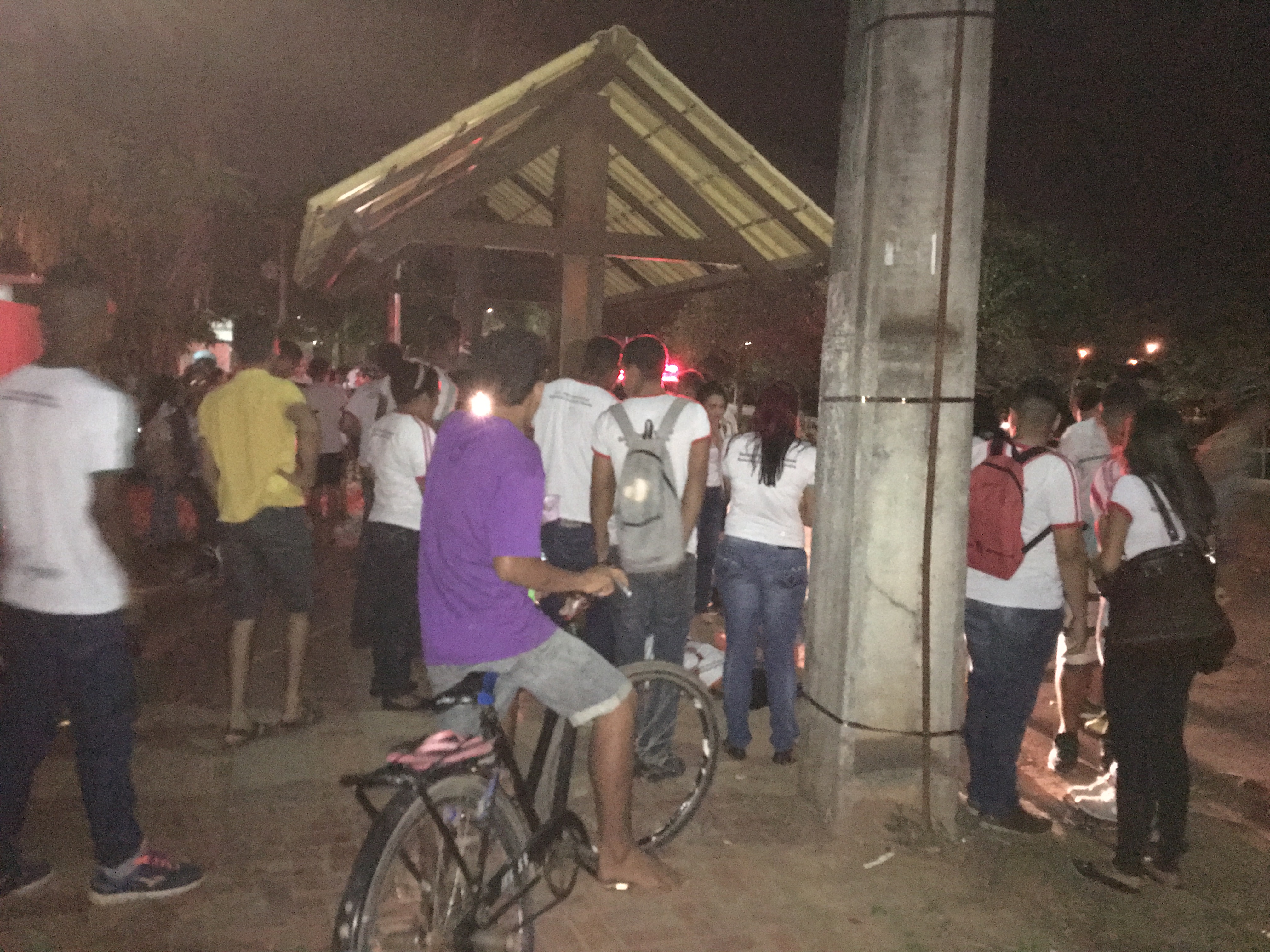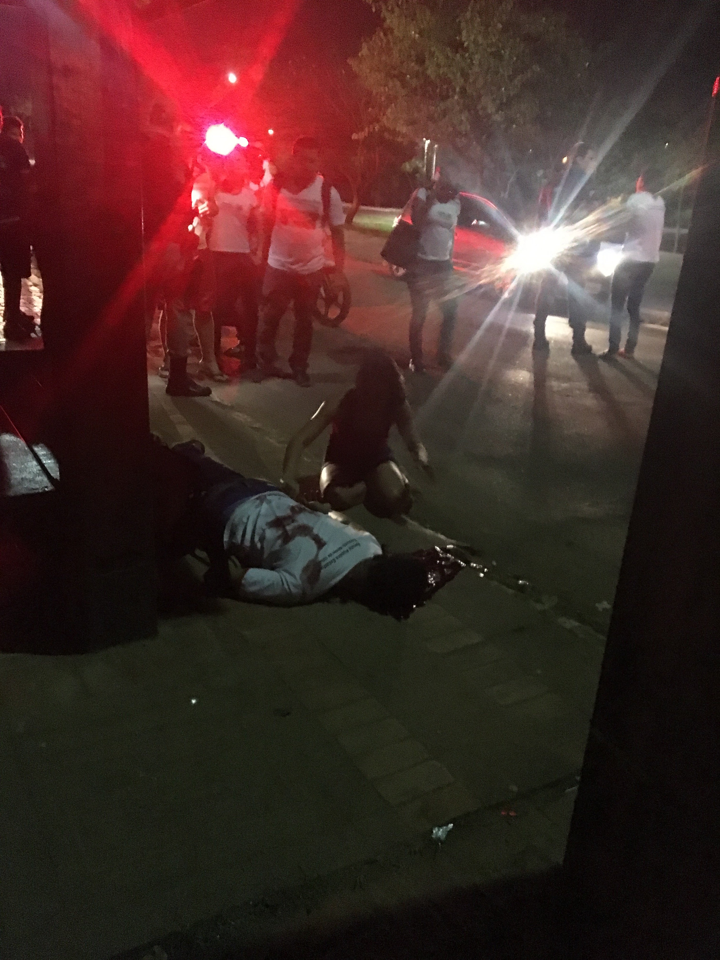 A namorada da vítima, que chorava muito ao lado do corpo estendido no asfalto, disse que o assassino apontou a arma para sua cabeça, após ter atirado contra Kelvin Brito.