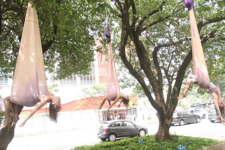 Três bailarinas fazem poses penduradas em casulos de tecidos que transparecem delicadamente a silhueta humana. A alguns metros do chão, as artistas dançam uma lenta coreografia em uníssono, onde criam diferentes e contemplativas posições dos corpos suspensos.