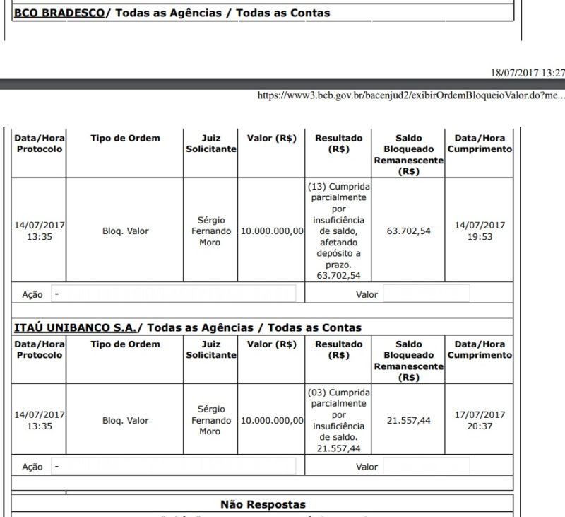 Moro detalhou os valores que deveriam ser bloqueados de Lula. “Como já decretado o sequestro e o confisco do apartamento, o valor correspondente deve ser descontado dos dezesseis milhões, restando R$ 13.747.528,00. Cabe, portanto, a constrição de bens do ex-presidente Luiz Inácio Lula da Silva até o montante de R$ 13.747.528,00.”