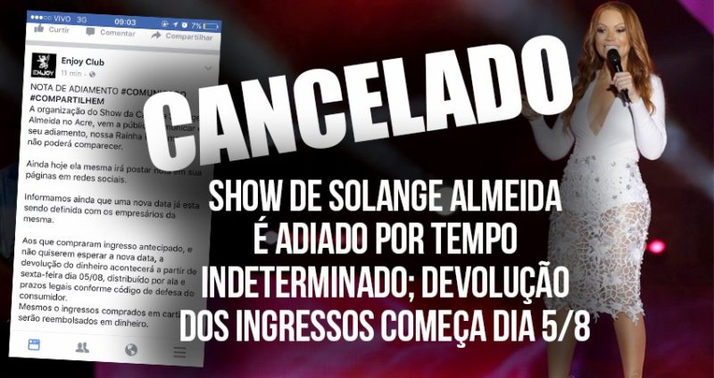 A organização do Show da Cantora Solange Almeida no Acre, vem a público comunicar o seu adiamento, nossa Rainha infelizmente não poderá comparecer.