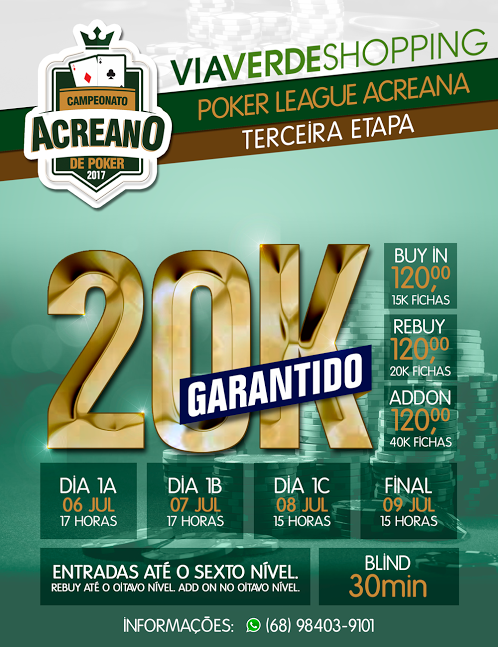 Atenção, amantes de Poker! A terceira etapa do Campeonato Acreano de Poker 2017 será realizada pelo grupo Poker Acre no Via Verde Shopping, entre os dias 6 e 9 de julho, no espaço ao lado da Livraria Nobel, a partir das 17h no primeiro e segundo dia, e a partir das 15h no terceiro e quarto dia. Qualquer pessoa acima de 18 anos pode participar do campeonato. A inscrição no valor de R$ 120 e pode ser feita na hora do jogo nos três primeiros dias de evento. A premiação está estimada em R$ 20 mil.