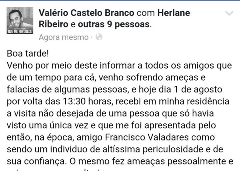 “Fiz uma gravação bastante esclarecedora e reveladora sobre os motivos e pessoas, as quais acredito que teriam motivos para fazerem qualquer tipo de atentado contra minha vida, pois ouvi e sei de muitas coisas. Essa gravação foi repassada para várias pessoas de minha total confiança e a mesma será divulgada para a polícia e todas as pessoas que me conhecem se eu vir a sofrer qualquer tipo de terrorismo”, escreveu Valério.