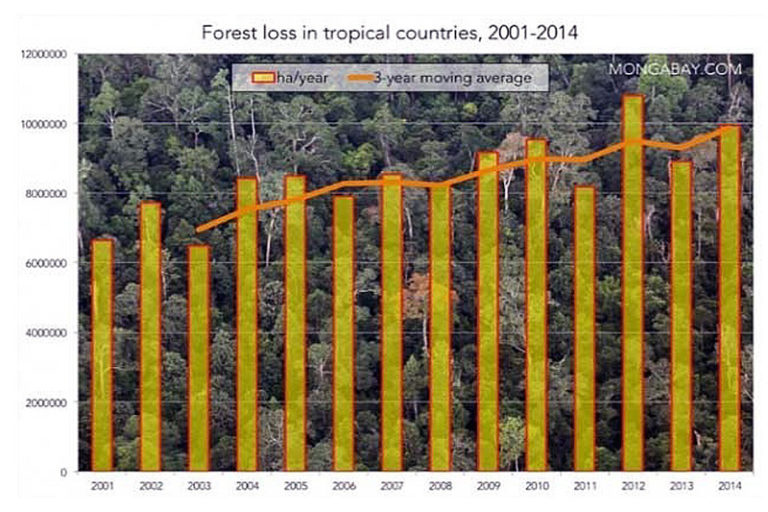 A tendĂȘncia trienal sintetizada na linha laranja mostra que enquanto em 2001, perderam-se pouco mais de 60 mil kmÂČ de florestas tropicais, em 2014, a perda foi de 99 mil kmÂČ. Entre 2001 e 2004, o Brasil perdeu mais florestas que todos os paĂses tropicais juntos, mas a partir de 2011, embora o desmatamento no Brasil venha recrudescendo desde 2012, outros paĂses tropicais tomam a dianteira, tornando-se os maiores responsĂĄveis por essa aceleração, como mostra a figura 2.