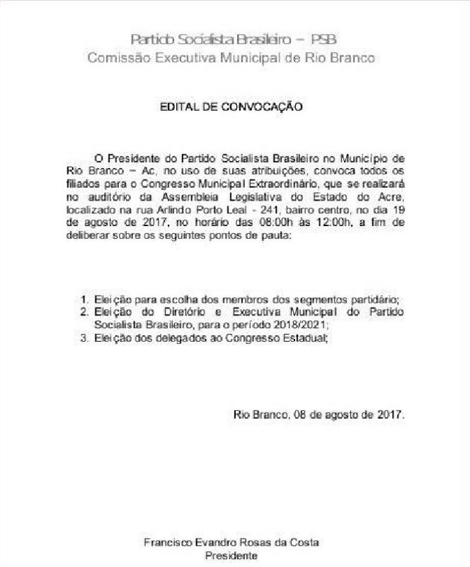 O presidente Partido Socialista Brasileiro (PSB) de Rio Branco, convoca todos os filiados para participarem do Congresso Municipal, que acontecerá no dia 19 de agosto de 2017 às 8:00h no auditório da Assembleia Legislativa do Estado do Acre – ALEAC.