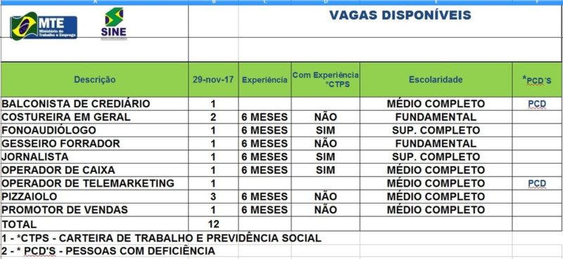 O Sistema Nacional de Emprego do Acre (Sine) disponibiliza 12 vagas para diversas áreas nesta quarta-feira (29) na capital acreana.